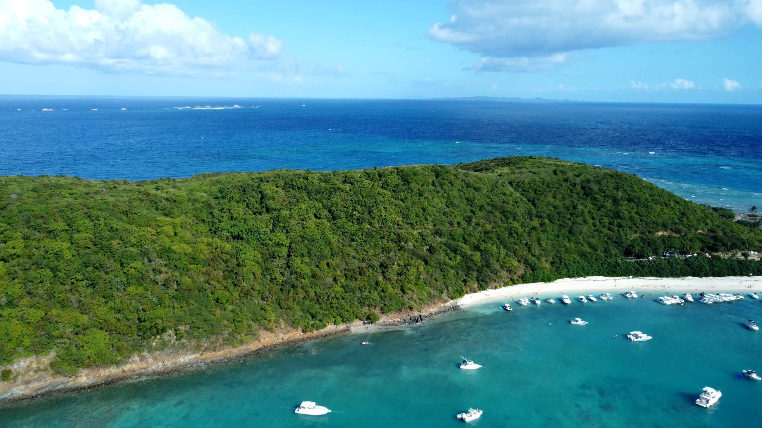 - Aerial drone view of Saona Island in Punta Cana, Dominican Republic with reef, trees and beach in a tropical landscape with boats and vegetation